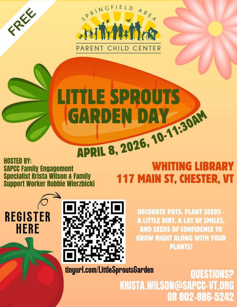 SAPCC Family Engagement Specialist Krista Wilson and Family Support Worker Robbie Wierzbicki invite children and families to dig in and grow some fun with us at the Whiting Public Library in Chester! 🌱